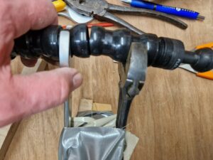 J’ai entamé une conversation sur l’excellent forum plongeur.com (lien direct vers l’article) , et un pilier m’a suggéré de rapprocher les deux parties avec des ligatures, au moyen de fil électrique. J’ai essayé avec du 2,5 mm², sans succès.